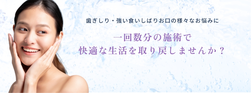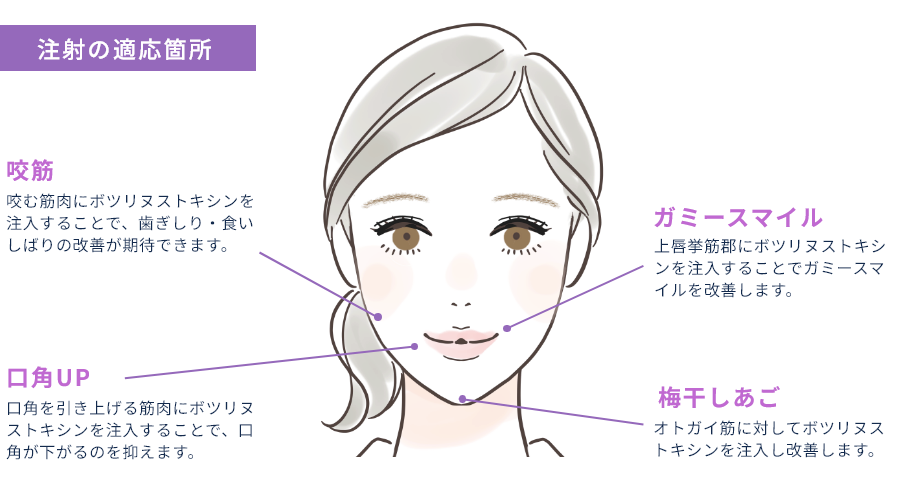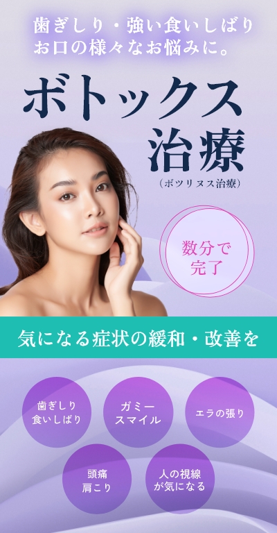 ボトックス治療(ボツリヌス治療)はボツリヌストキシンから抽出された天然のタンパク質を注入することで、筋肉をリラックスさせ「歯ぎしり」「食いしばり」「ガミースマイル」「エラ張り」等を改善する治療法です。
